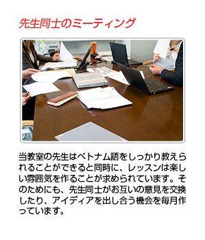 「ベトナム人のネイティブ講師からベトナム語を習う」、それはとても大切なことです。語学学習は2つの側面があります。1つは、徹底して発音などをまねして覚えるといった「繰り返す学習」と、文法やニュアンスの違いなどの「理論の学習」があります。人間は大人になると、子供のように「まねして学習」するだけでは不十分であり、文法やニュアンスの違いを理論的に学習することが必要になります。理論の説明はベトナム語だけ説明すると説明自体が理解できないこともありえます。上級者の方に対してはベトナム語だけで細かなニュアンスの違いを説明することも可能ですが、初級者には日本語で説明することが必要になります。だからこそベトナム人講師は日本語ができることは必要です。また、ベトナム人講師は自分自身の日本語を学習過程で、ベトナム語と日本語の違いを自然と気付いていくことになるので、自分自身がベトナム語と日本語の違いにつまづいてきた所もよくわかります。よって日本人に対してよりよい説明&練習の実践ができるようになります。
